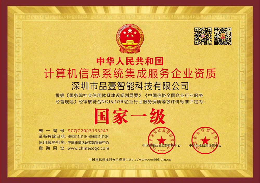 • 国家一级计算机信息系统集成服务企业资质