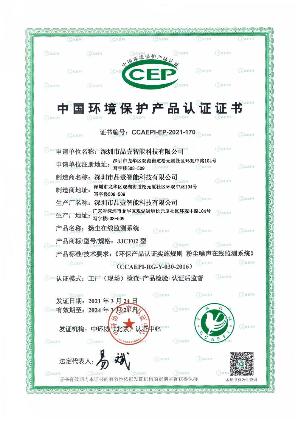 • 中国环境保护产品认证证书