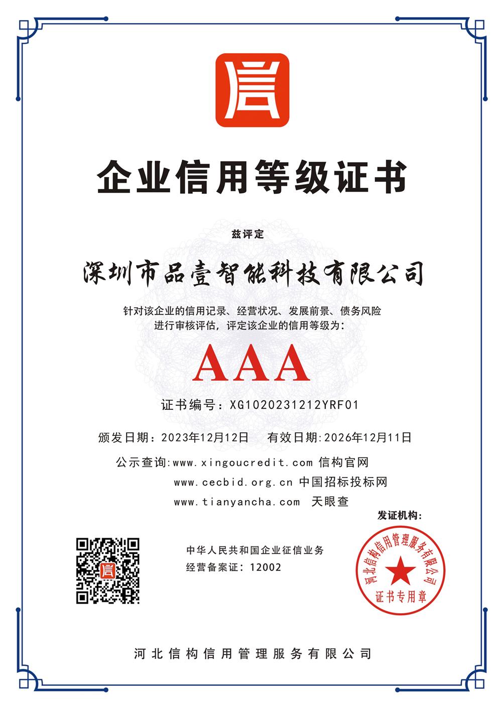 AAA级企业信用等级证书