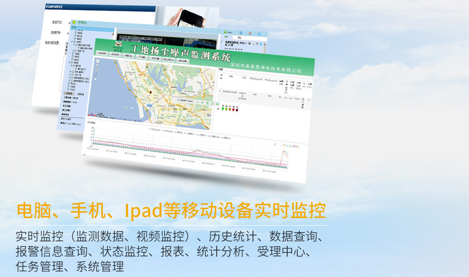 我司工地扬尘噪声监测设备在符合要求的建设工地内安装在线监控系统后,将对工地进行连续不间断监测,并配套视频监控系统、噪声监控系统、温度、湿度、PH2.5、气象系统、数据采集系统和通信系统等,与各级环保局污染源监控中心无缝对接,实现互联互通,同时自建云平台及服务器,免费提供给用户自行登录查询,下载。实时监控
